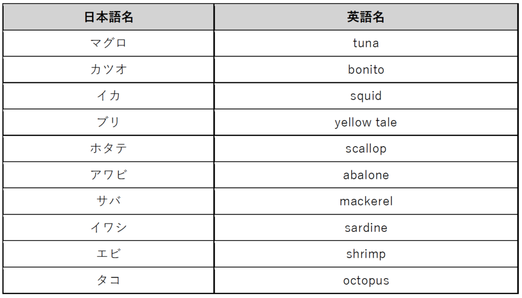まさに今⾷べているものについて話せばよいので⼿っ取り早い。ポイントは和⾷の場合。横⽂字の⾷べ物は⽚仮名ながら⼀応名前はわかるが、和⾷は普段⽇本語で表現しているため、英語で何というのかとっさにわからないことがある。是⾮予習しておこう。特に、ポピュラーな寿司ネタくらいはすぐに⾔えるように(以下参照)。